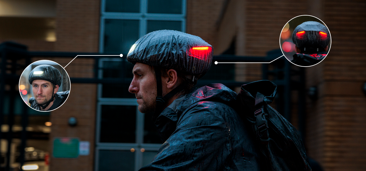 Sudden downpour? No problem. This fully transparent waterproof cover shields your helmet from the rain while keeping both front and rear lights clearly visible .